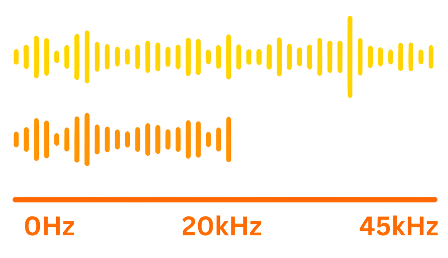 Our hearing range (represented by the orange waveform) typically extends up to 20kHz, allowing us to hear a wide variety of sounds.